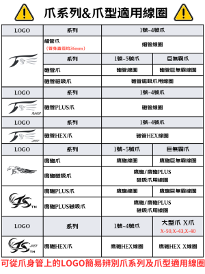 爪身管上的LOGO可供您簡易辨別爪系列,線圈&爪型適用表請參考頁面圖🎉