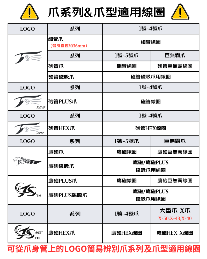 爪身管上的LOGO可供您簡易辨別爪系列,線圈&爪型適用表請參考頁面圖🎉